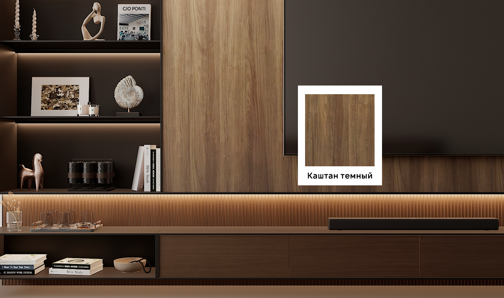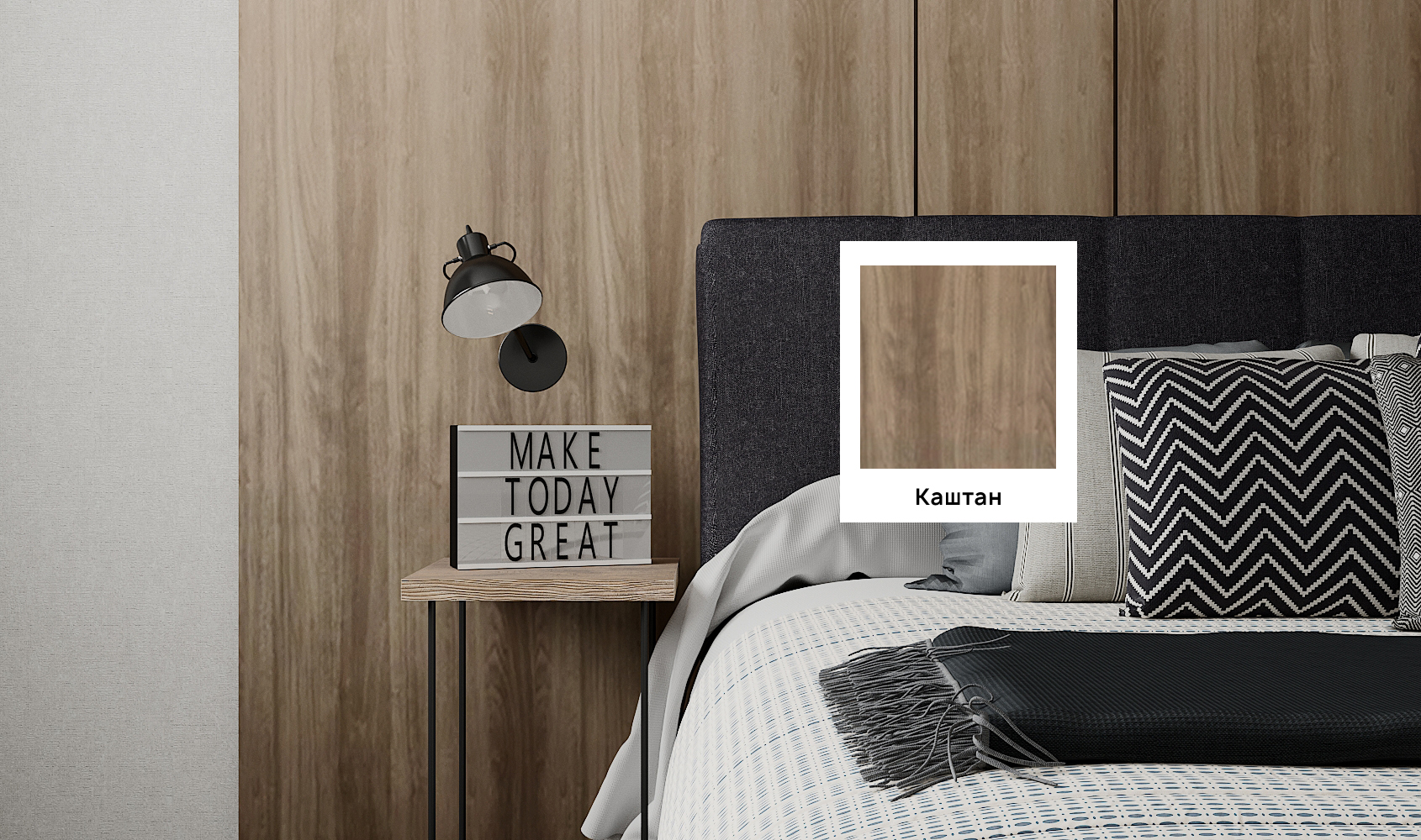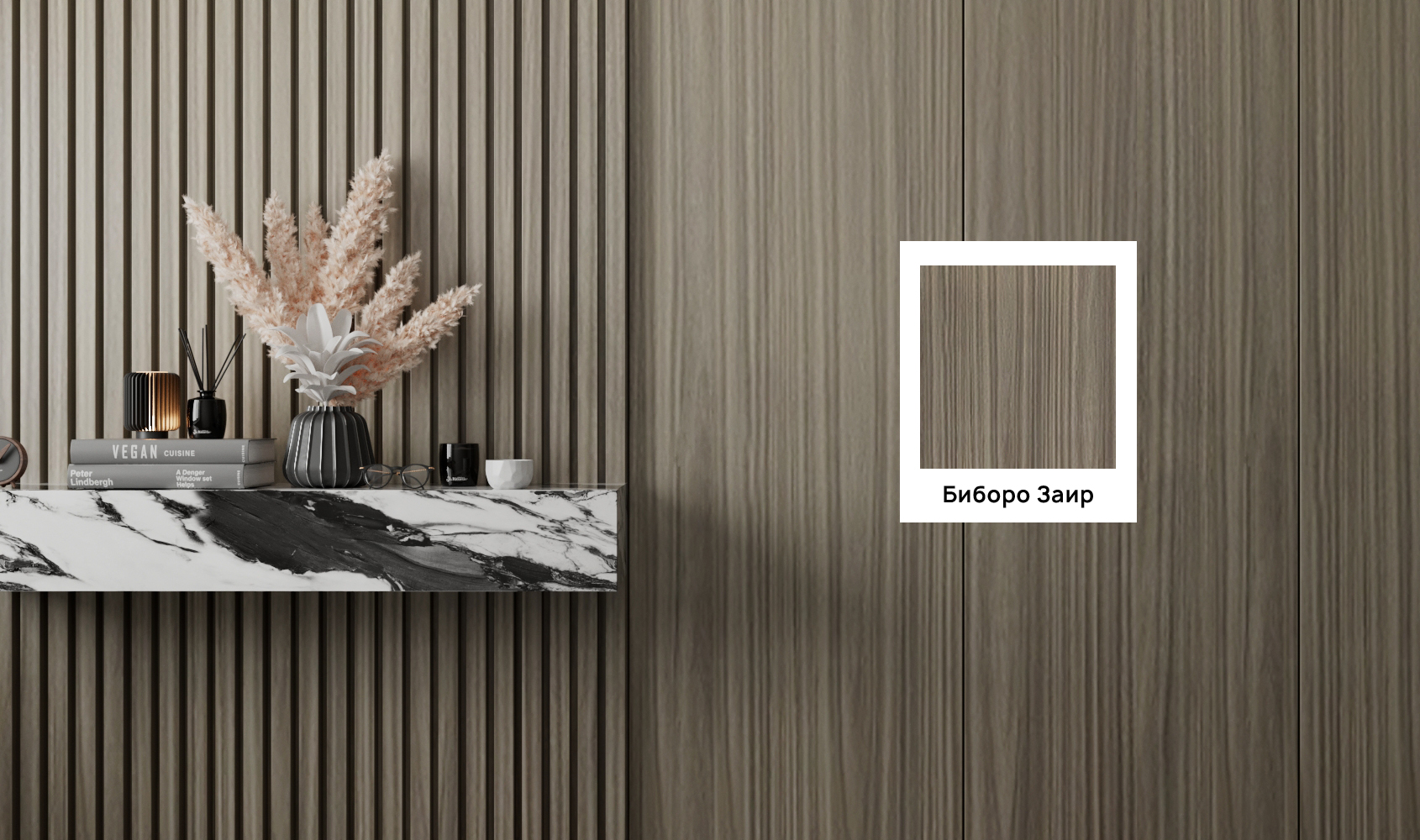 Отделка с текстурой каштана представлена в 3-х цветовых решениях: “Каштан светлый”, “Каштан”, “Каштан темный”. У покрытия ярко выраженная текстура с крупными годичными кольцам.