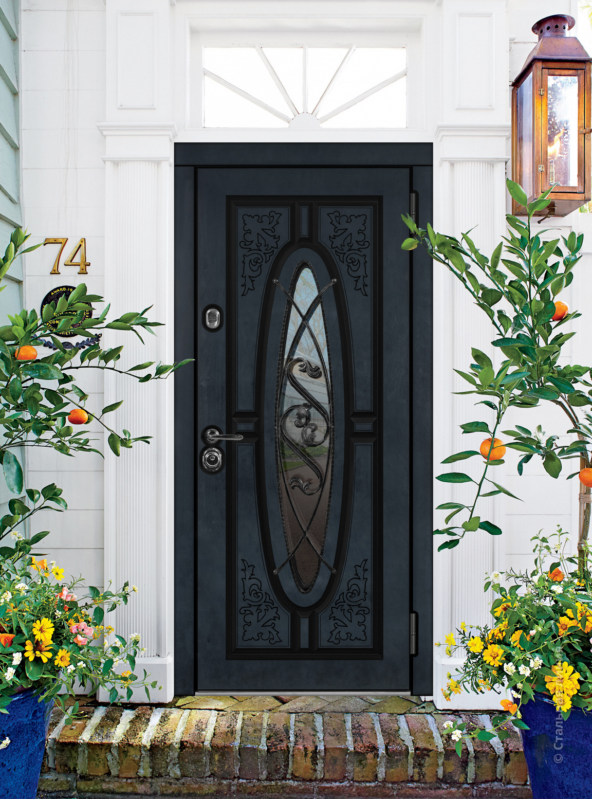 А в экстерьере дома окно сыграет особую роль. Это выгодный штрих, который помогает сделать полотно двери гармоничной частью отделки. Флористический рисунок ковки, которая обрамляет окно, навевает мысли о винограде или плюще, которые так живописно вьются по стенам. Сочетание неброского стеклянного блеска и насыщенного тона дверного полотна, дополненные художественной ковкой, подчеркивают ощущение респектабельности и сдержанной роскоши, которые присущи классическому стилю.