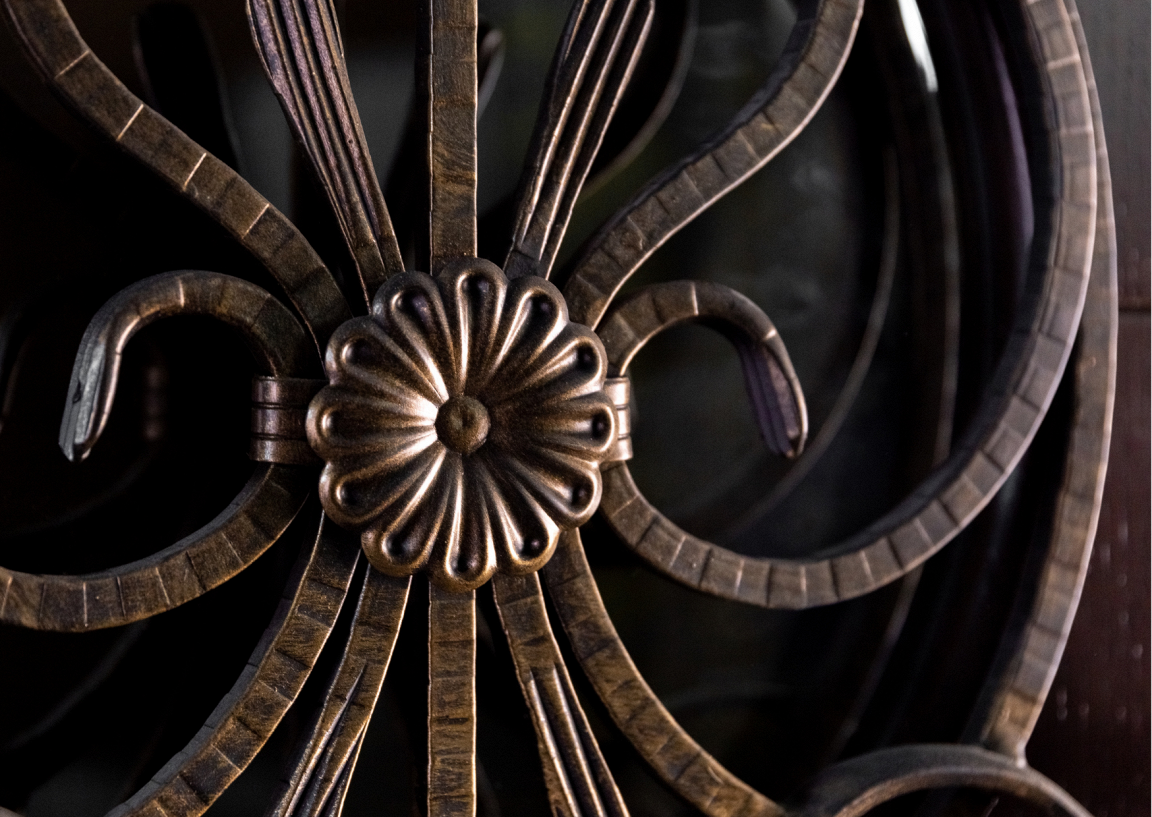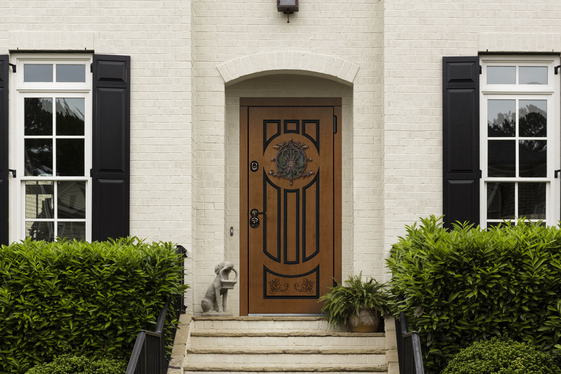 Изысканная решетка О1 расположена внутри полотна. Она выглядит воздушно и элегантно, вязь рисунка подчеркивает благородный классический стиль входной двери.