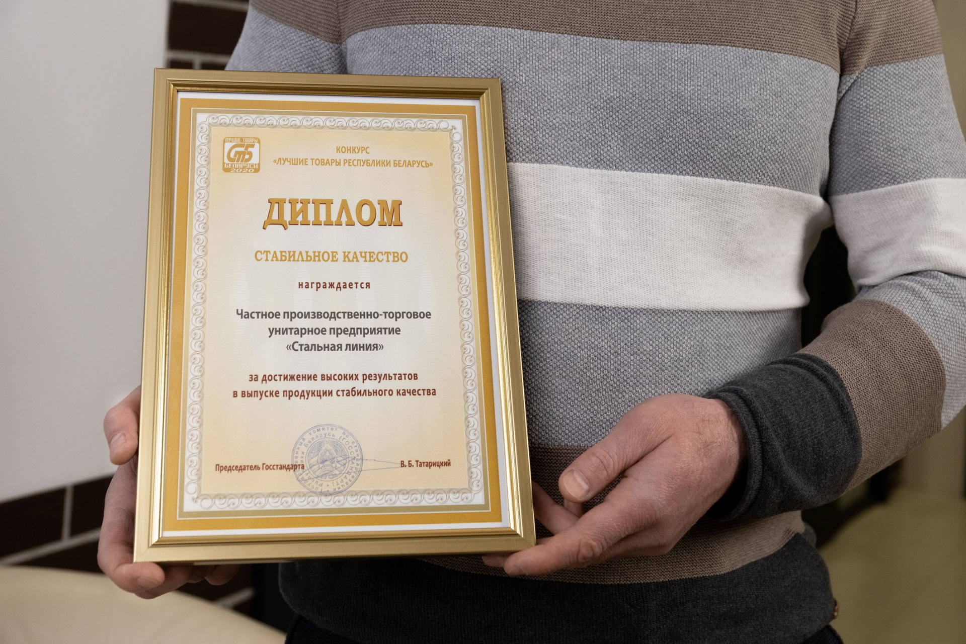 «Стальная линия» получила диплом «Стабильное качество». Этой награды завод удостоился, поскольку на протяжении 6-ти лет становился лауреатом конкурса «Лучшие товары РБ» и подтверждал высокое качество продукции.