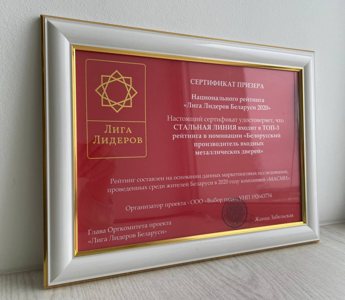 Мы рады, что вы выбираете нас, ведь именно уровень вашего доверия к нам послужил основанием для награждения компании почетным местом в рейтинге. Наша продукция будет носить знак «Лиги лидеров» два года, а потом мы снова постараемся оправдать ваши ожидания и подтвердить звание лидеров по производству входных металлических дверей на рынке Беларуси.