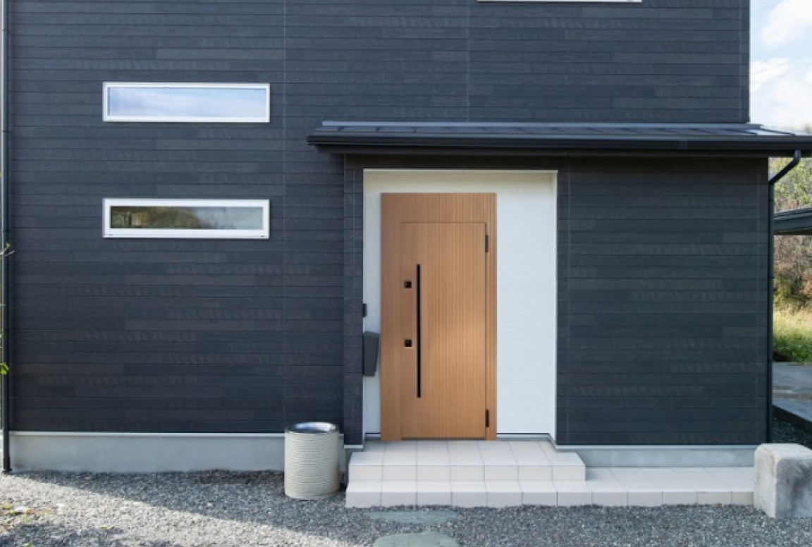 Входные двери в этом стиле отделаны натуральным деревом. На них нет отвлекающих элементов. Любители яркого дизайна могут окрасить полотно или короб в контрастные цвета.