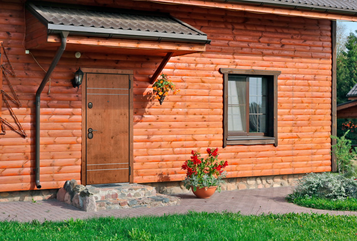 Входные двери в этом стиле покрывают шпоном натурального дерева или покрытием с имитацией рисунка дерева. В качестве украшения добавляют окно с кованой решеткой или витражами.