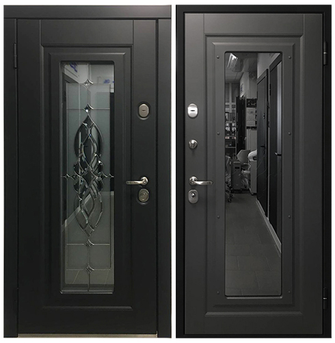 Снаружи: SteelLak «Черно-серый» RAL 7021, структурный, рис. O-G.2, окно G, стекло зеркально-тонированное, витраж B3, серебро