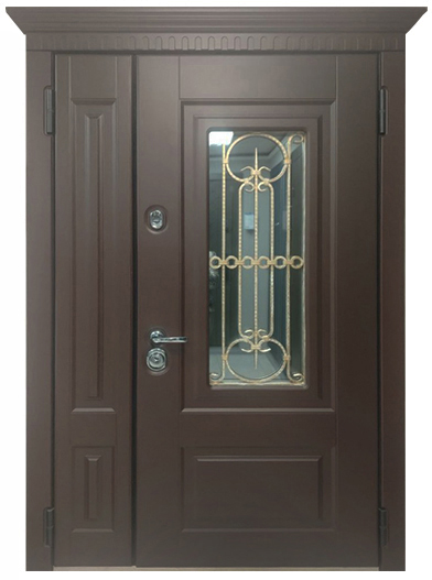 Снаружи: SteelLak «Коричневый» RAL 8017, гладкий, рис. O-B.3, окно B, стекло зеркально-тонированное, решетка B1, белый с золотой патиной