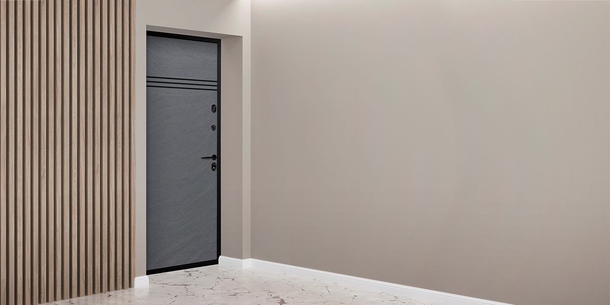 Модель «Квинс» — входная дверь в квартиру с отделкой под камень Серии 73.