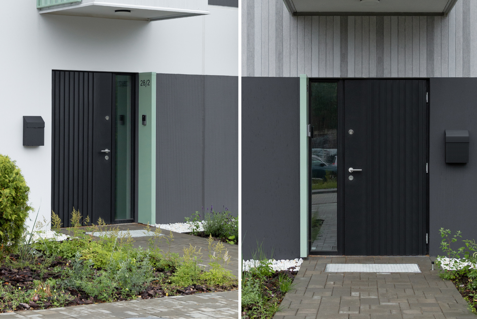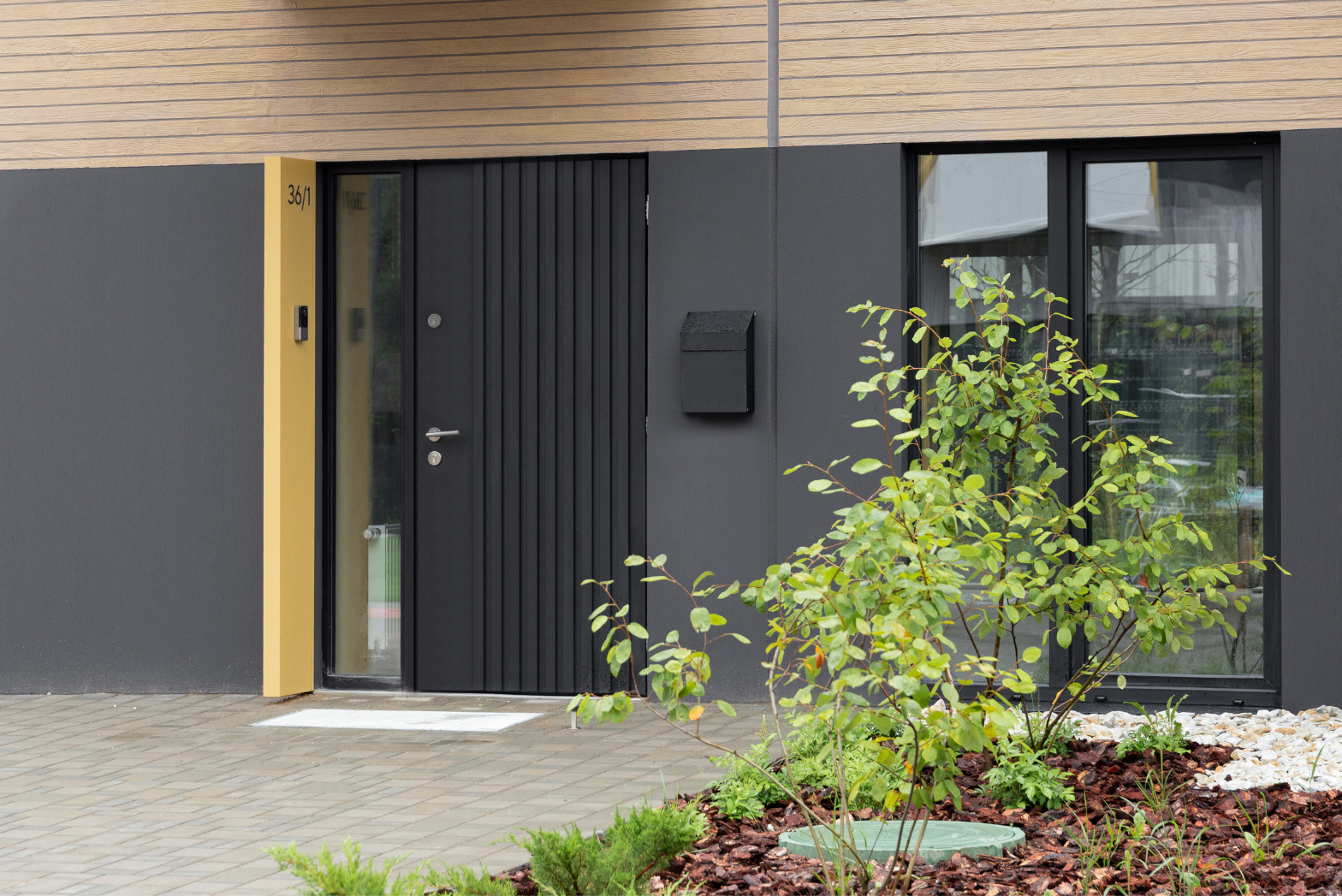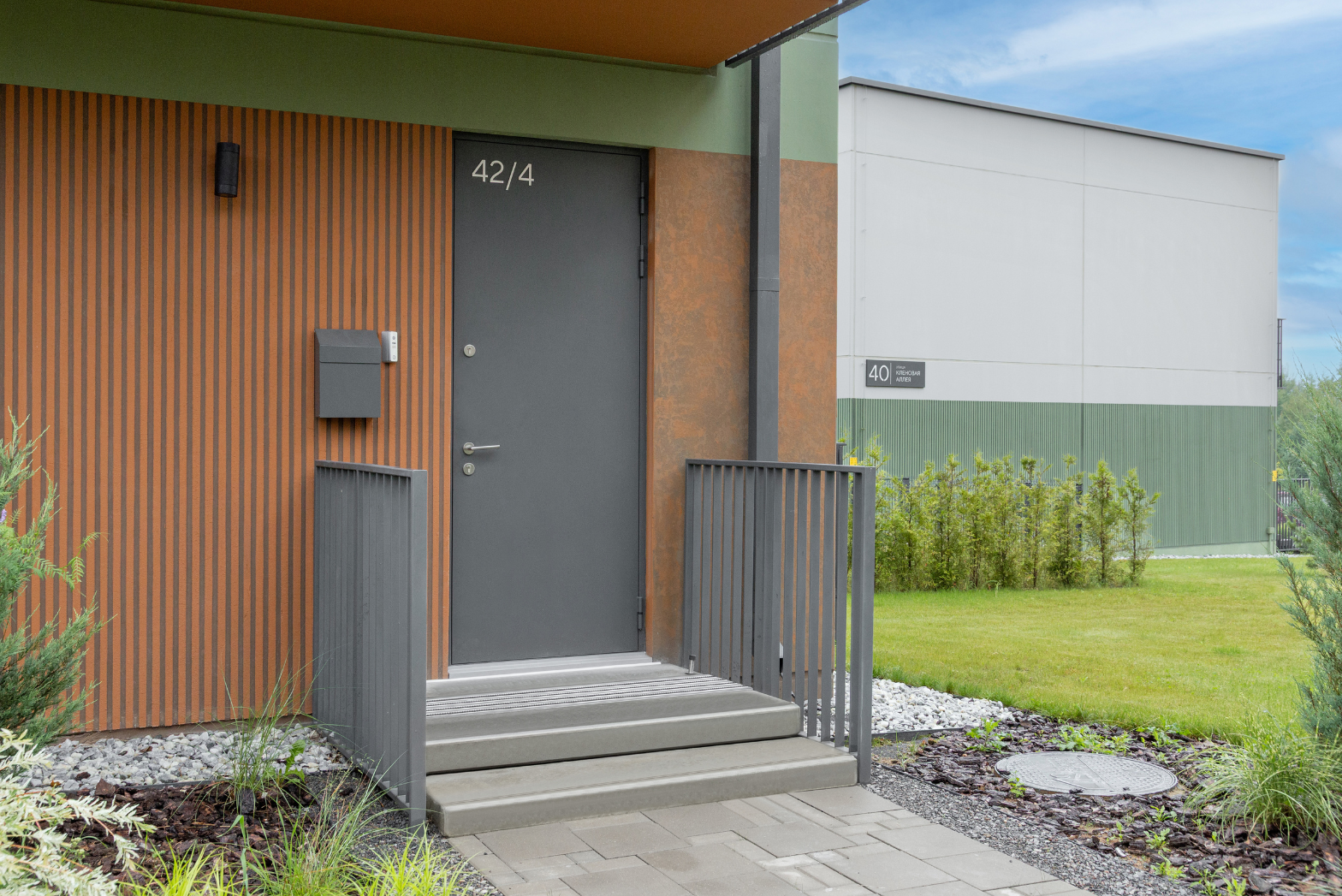Дополнительные декоративные элементы: ручки-стучала, фурнитура, цифры, отбойник и почтовый ящик добавят акцент для входной двери и помогут создать единый гармоничный стиль входной группы.